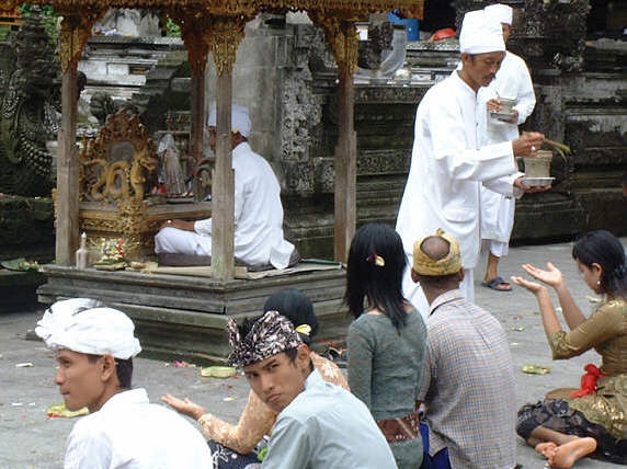Tirta Empul Tempel - Balinesen und Touristen baden im heiligen Wasser
